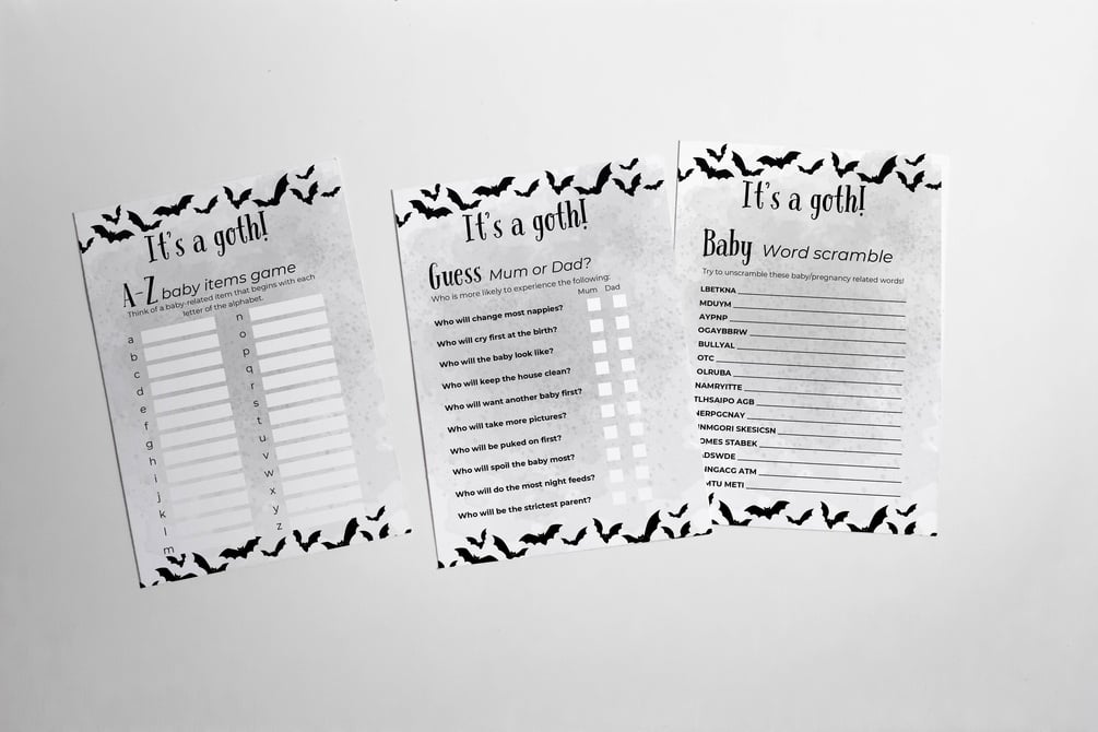 Calling all spooky mamas, this baby shower kit was made for you! (Not everyone loves baby blue or bright pink, babies can be goths too you know!) Download to print at home to keep costs down or to take to your local print shop.
